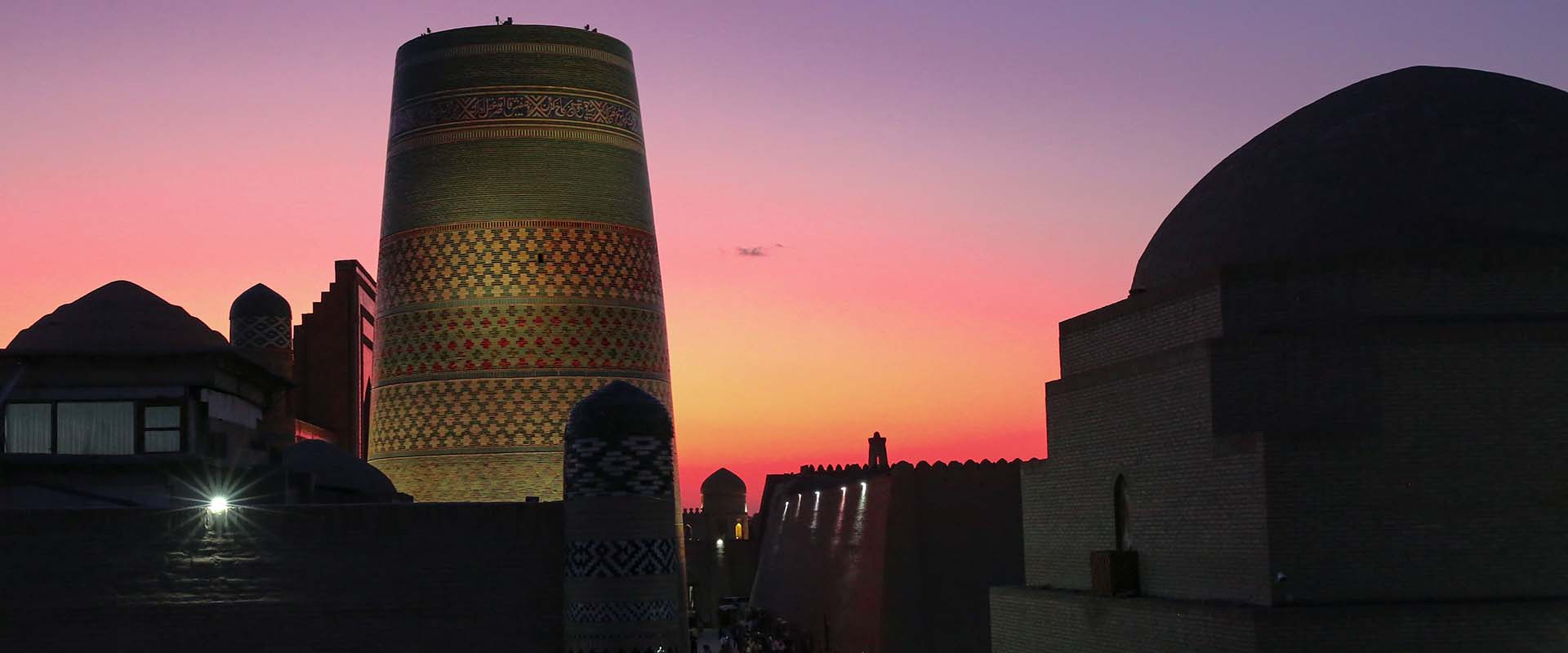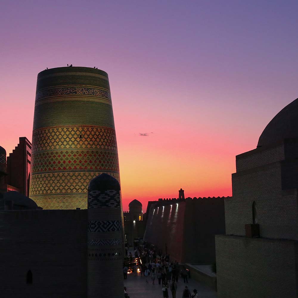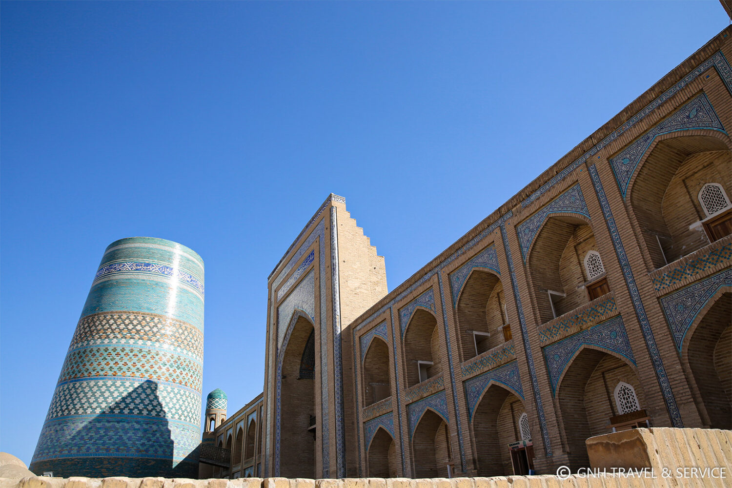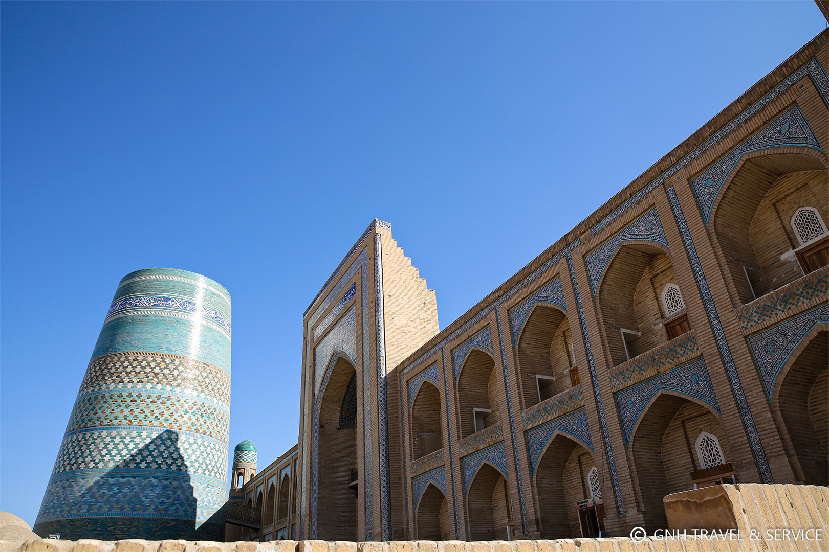 ヒヴァ着後、イチャンカラの散策と観光にご案内します(イスラムホジャ・メドレセ、ジュマ・モスク、タシュハウリ宮殿、クフナ・アルク、未完の大ミナレット カルタ・ミナール等)。